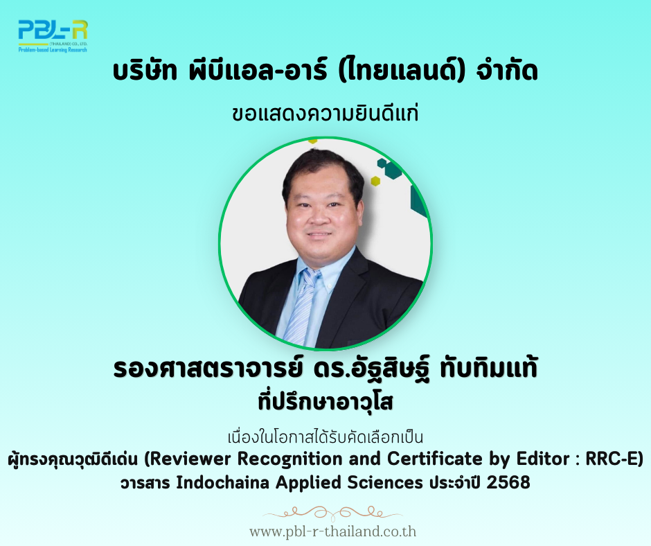 บริษัท พีบีแอล-อาร์ (ไทยแลนด์) จำกัดขอแสดงความยินดีแก่รองศาสตราจารย์ ดร.อัฐสิษฐ์ ทับทิมแท้ที่ปรึกษาอาวุโสเนื่องในโอกาสได้รับคัดเลือกเป็นผู้ทรงคุณวุฒิดีเด่น (Reviewer Recognition and Certificate